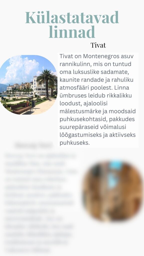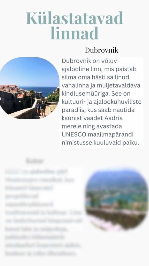 Reisi jooksul saab külastada 4 Montenegro linna (Kotor, Tivat, Perast, Herceg Novi) ja ühte Horvaatia linna (Dubrovnikut).