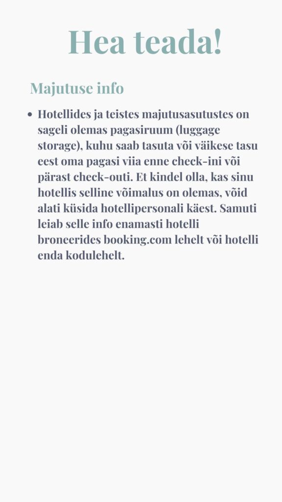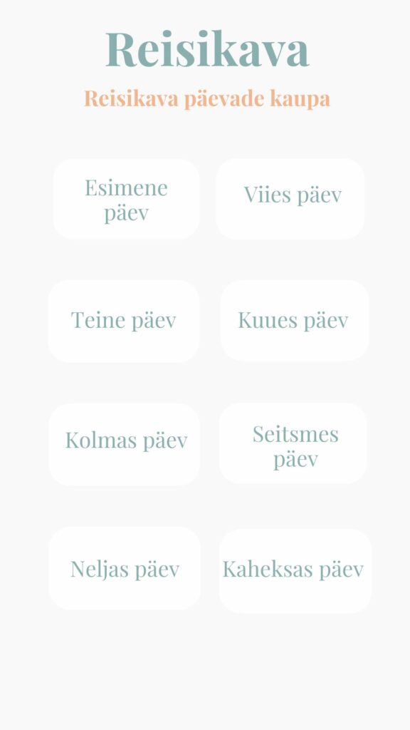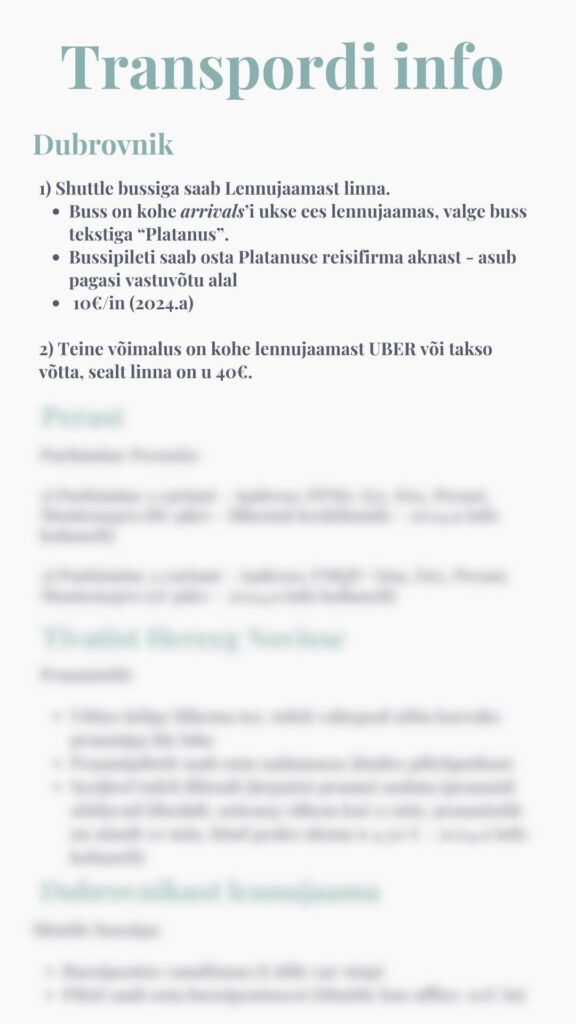 (NB! Reisikava ostes tuleb mõista, et ostate reisiKAVA, kui digitaalse toote, mitte reisiPAKETI. Kõik teenused, mis hõlmavad majutuse broneeringuid, lennu- ja ühistranspordipileteid, autorenti ja tuuripiletite broneeringuid, tuleb kliendil endal teha.)
