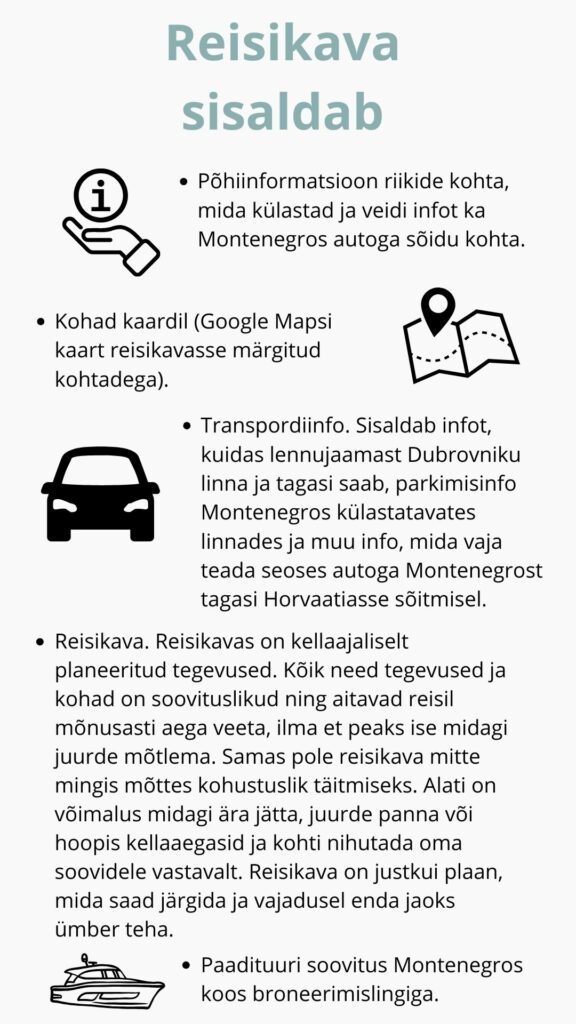 Reisikava alguspunktiks on Dubrovniku linn, mis asub Horvaatia lõunaosas. Dubrovnik on hea algus-ja lõpp-punkt nädalasele reisile, mille peasihtkoht on Montenegro. Reisikava on koostatud nii, et väikese ajaga oleks võimalik näha mitmeid kauneid kohti Montenegros ja Dubrovnikus (Horvaatias).